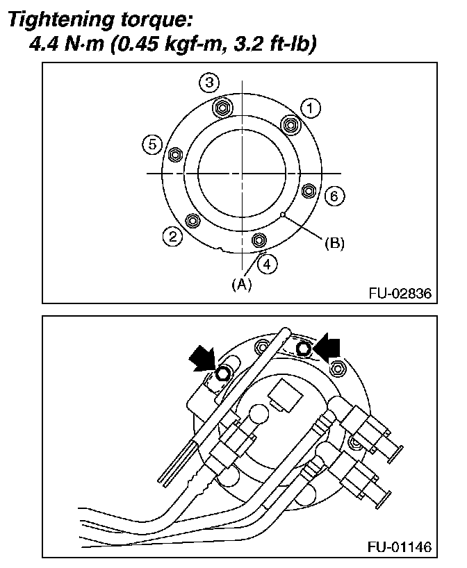 - Align the protrusion (B) of fuel sub level sensor with the cutout portion of fuel sub level sensor upper plate.