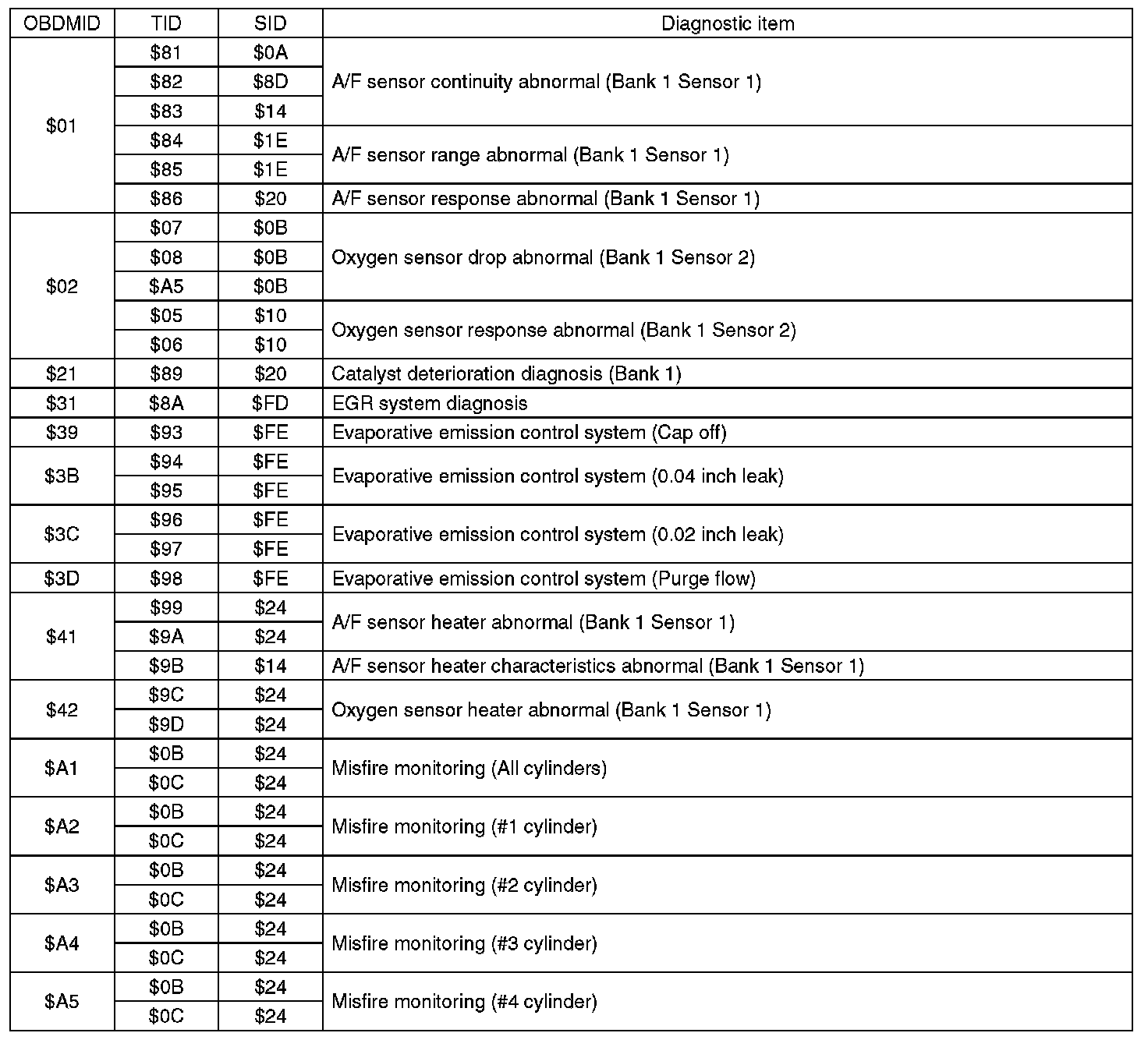 A list of the support data and PID (Parameter Identification) codes are shown in the following table.