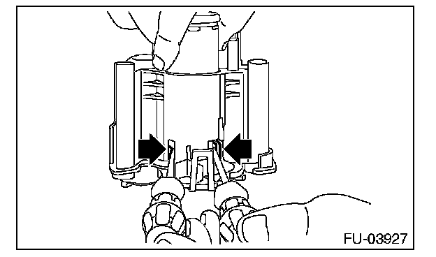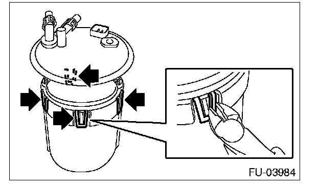 8. Lift the two tab holders connecting the pump assembly to the fuel filter using a flat tip screwdriver (with a shaft diameter of approx. 3 mm (0.12 in)), etc., and separate the fuel filter and pump assembly.