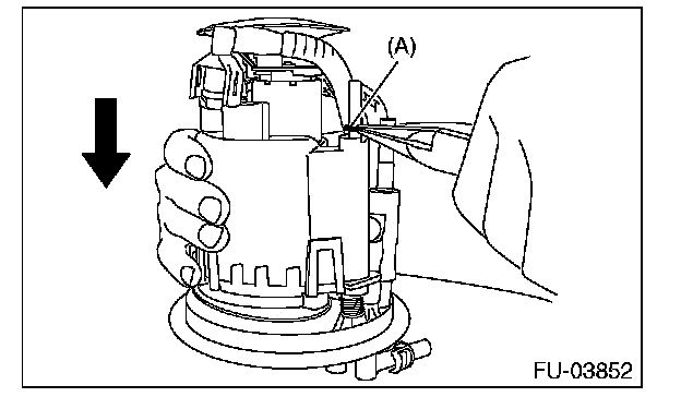 6. Push to compress the fuel filter assembly in the direction of the arrow, remove clip (A), and separate the sub tank bracket assembly and the fuel filter assembly.