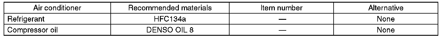 Standard air conditioners on Subaru vehicles use HFC134a refrigerant. Do not mix it with other refrigerants Also, do not use any compressor oil other than DENSO OIL 8.