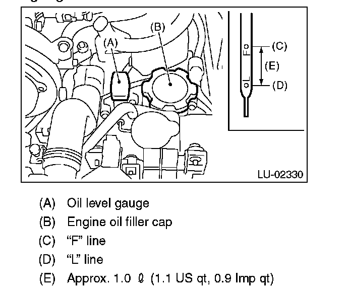 7. Using engine oil of proper quality and viscosity, fill engine oil through the oil filler duct to the "F" line on the level gauge. Make sure that the vehicle is parked on a level surface when checking oil level.