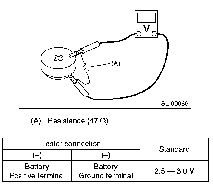 Measure the voltage between the keyless transmitter battery (+) terminal and (-) terminal.