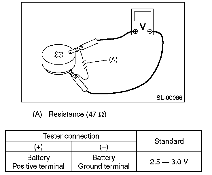 Measure the voltage between the keyless transmitter battery (+) terminal and ( ) terminal.
