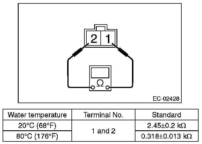 3. Raise water temperature gradually, measure the resistance between the engine coolant temperature sensor terminals when the temperature is 20 °C (68 °F) and 80 °C (176 °F).