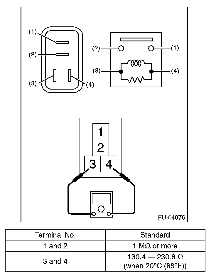3. Connect battery positive terminal to terminal No. 3 and battery ground terminal to terminal No. 4, and measure the resistance between the main relay terminals.