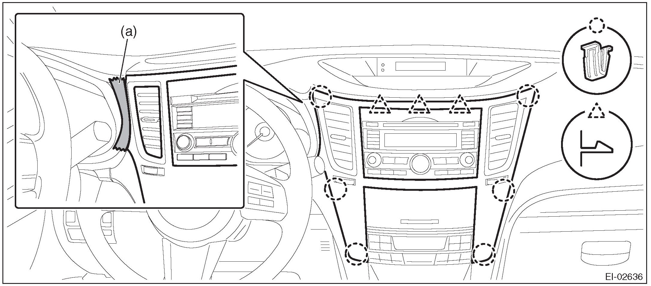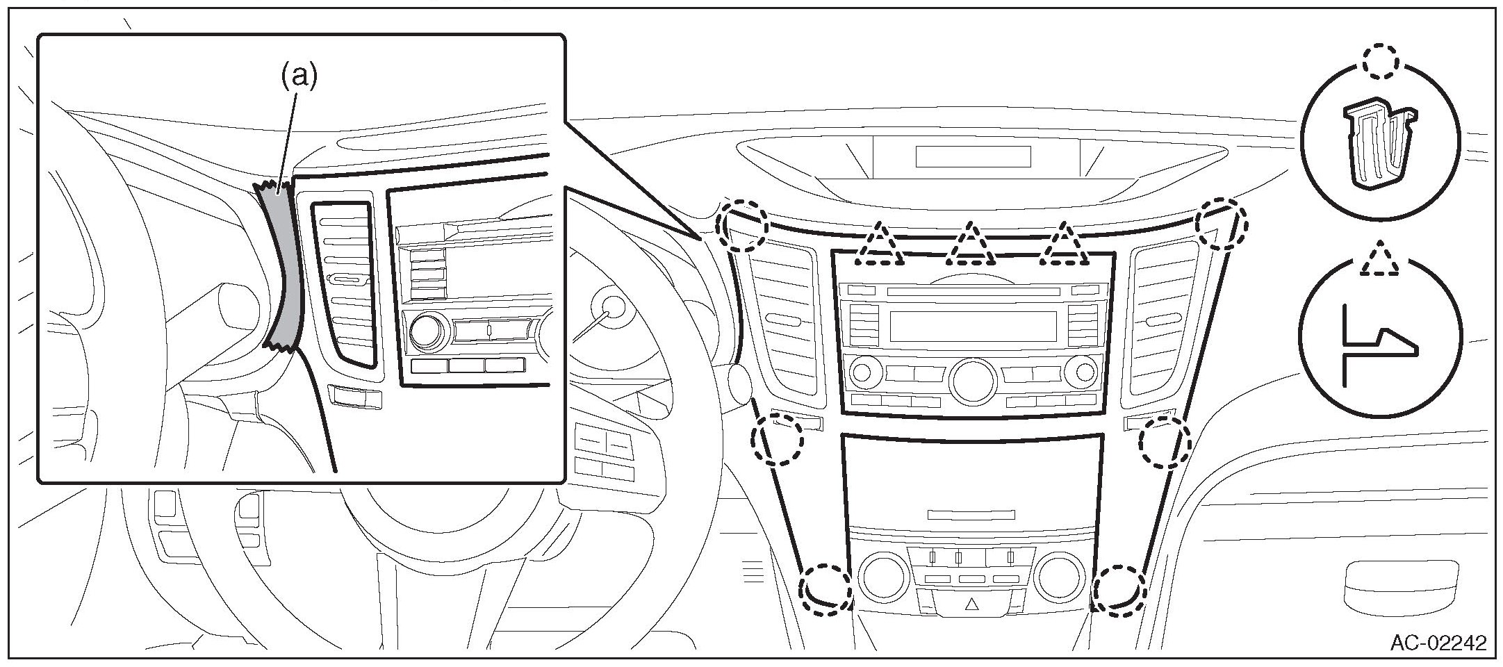 2. Insert a finger into the air vent grille and release the left and right clips at the top of the center panel. (A), (B)
