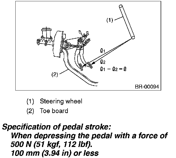 Run the engine at idle after warming up the engine, and depress the brake pedal with a force of 500 N (51 kgf, 112 lbf). Measure the distance between the brake pedal and steering wheel. Release the pedal, and measure the distance between pedal and steering wheel again.