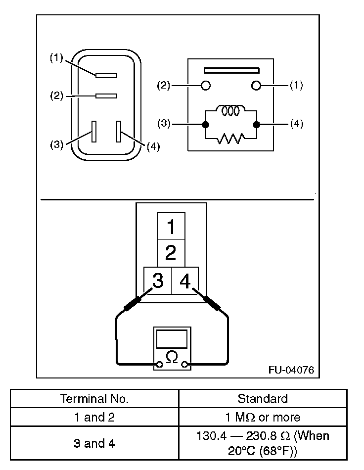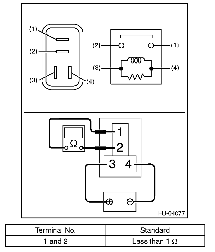 3. Connect battery positive terminal to terminal No. 3 and battery ground terminal to terminal No. 4, and measure the resistance between the main relay terminals.