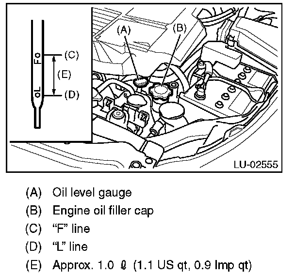 4) Pull out the oil level gauge again, and check the oil level. If the engine oil level is below "L" line, make sure that there is no oil leakage from the engine, then add oil to raise the level up to the "F" line.