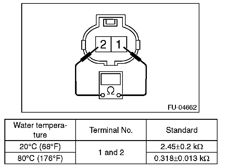 3. Raise water temperature gradually, measure the resistance between the engine coolant temperature sensor terminals when the temperature is 20 °C (68 °F) and 80 °C (176 °F).