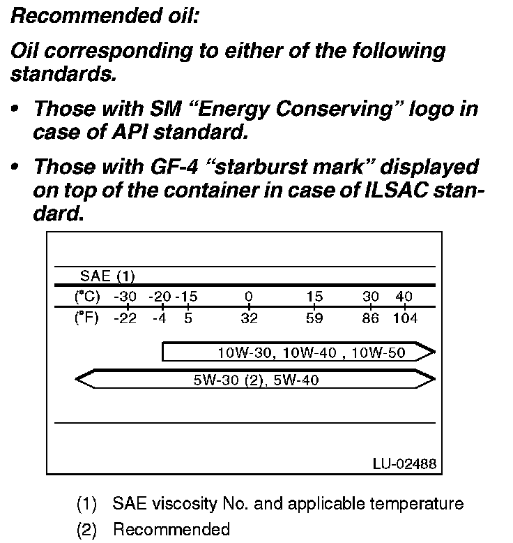 ^ If the vehicle is used in regions of high temperatures or in other severe environments, use oil with the viscosities shown below.