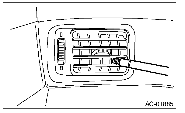 6. Turn the ignition key to the ON position, and run the blower at high speed for approx. 1 minute. Stop the blower and check the ventilation grille on the instrument panel. While moving the tester closer to the grille, run the blower for 1 or 2 seconds, then stop it. Check the grille at that position for at least 10 seconds.
