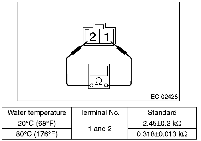 3. Raise water temperature gradually, measure the resistance between the engine coolant temperature sensor terminals when the temperature is 20 °C (68 °F) and 80 °C (176 °F).