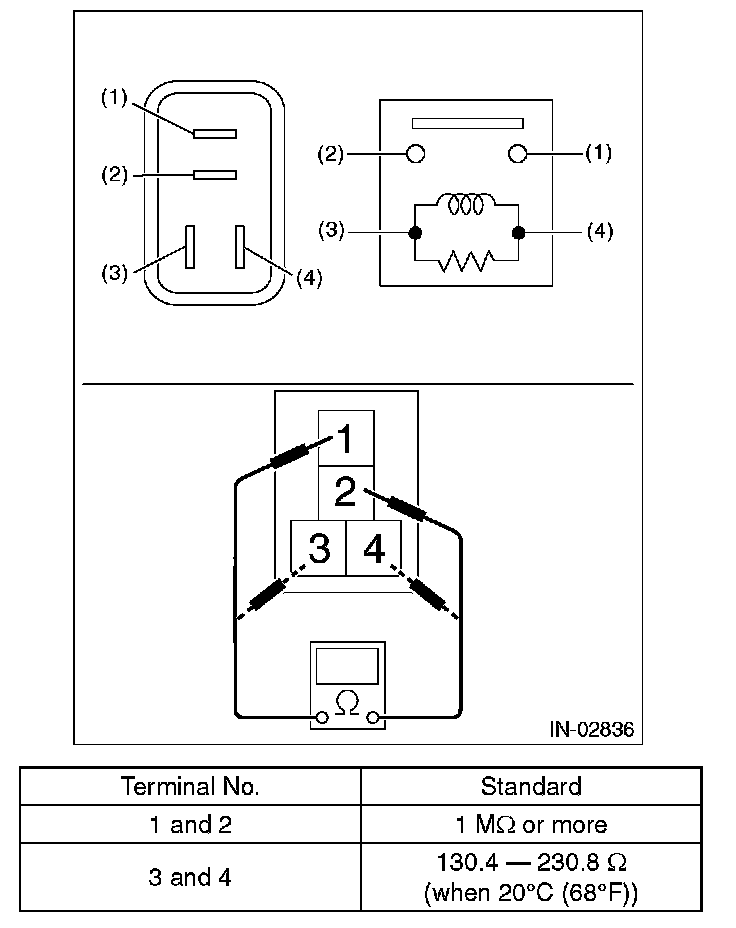 3. Connect battery positive terminal to terminal No. 3 and battery ground terminal to terminal No. 4, and measure the resistance between the main relay terminals.