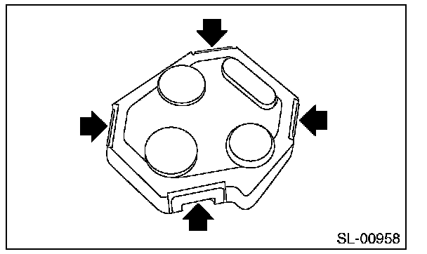 CAUTION: To prevent static electricity damage to the keyless transmitter printed circuit board, touch the steel area of building with hand to discharge static electricity carried on body or clothes before disassembling the keyless transmitter.