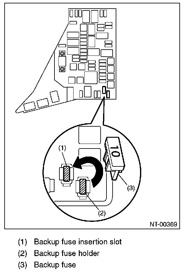 Right after the vehicle has arrived, 10 A backup fuse is removed to avoid run-down of the battery. Connect the backup fuse as shown in the figure. Also, delivery mode is canceled by disconnecting the backup fuse from the fuse holder.