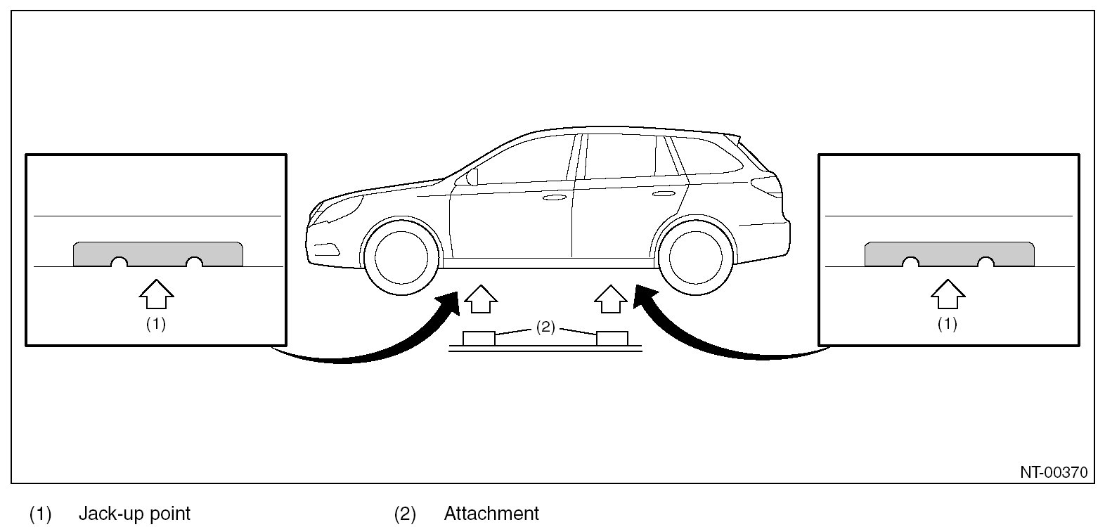 CAUTION: For models with side under skirt, use a spacer or an attachment to lift up the vehicle securely at jack up point, without contact of side under skirt and lift.