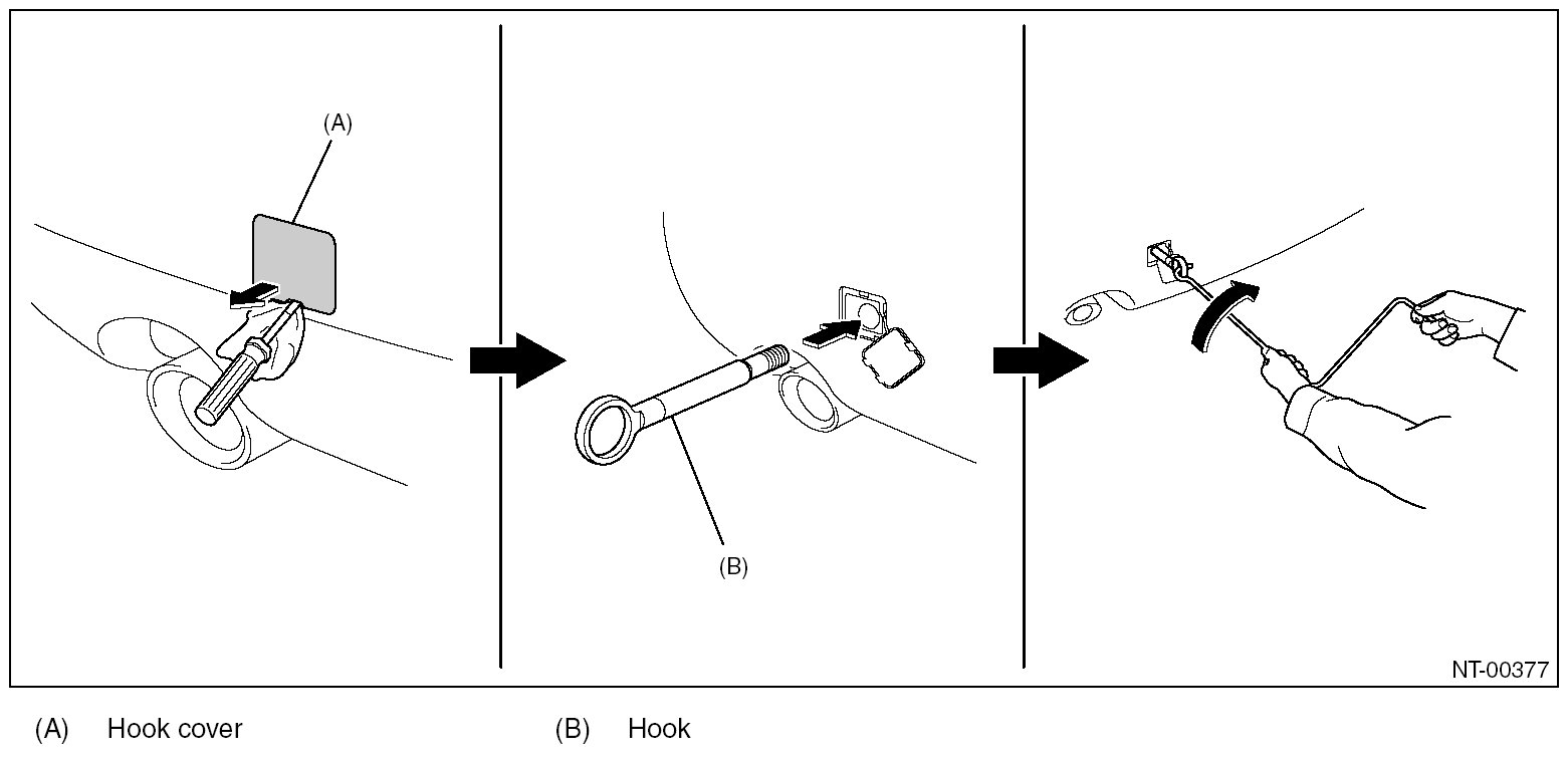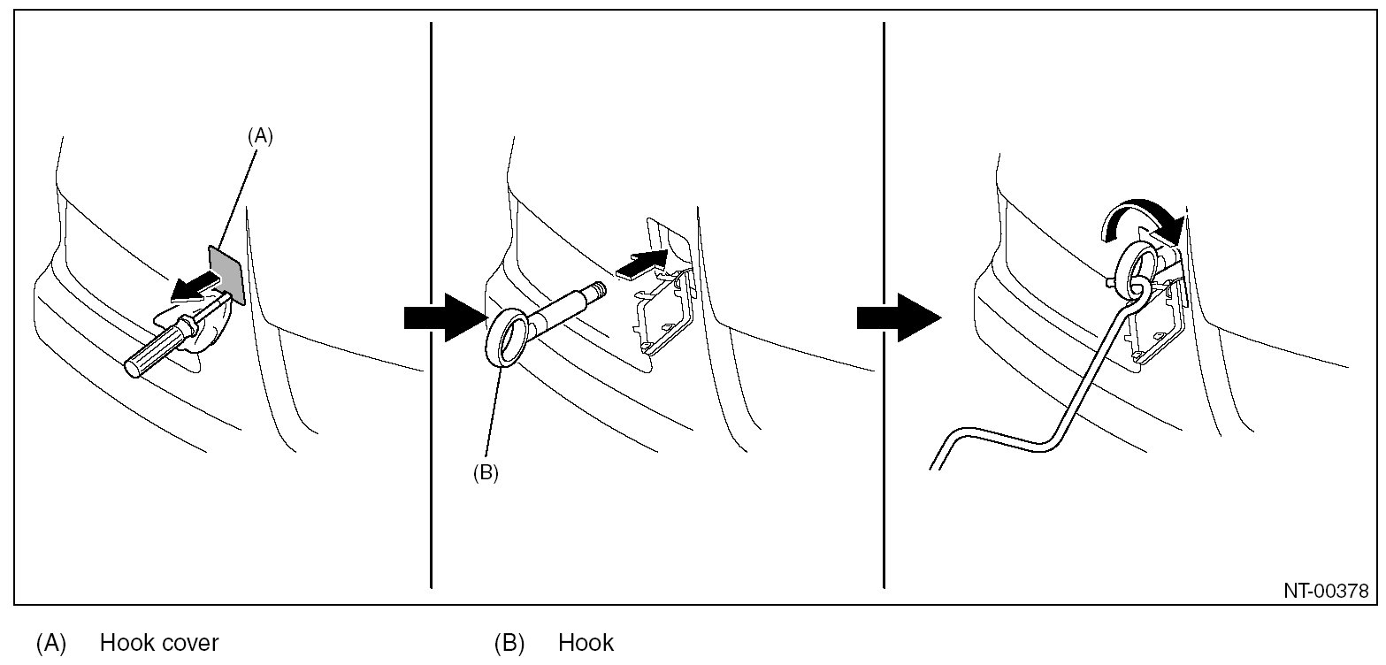 - Make sure to detach the towing hook after towing. If the hook remains attached, airbag may not operate properly when receiving a shock from front side.