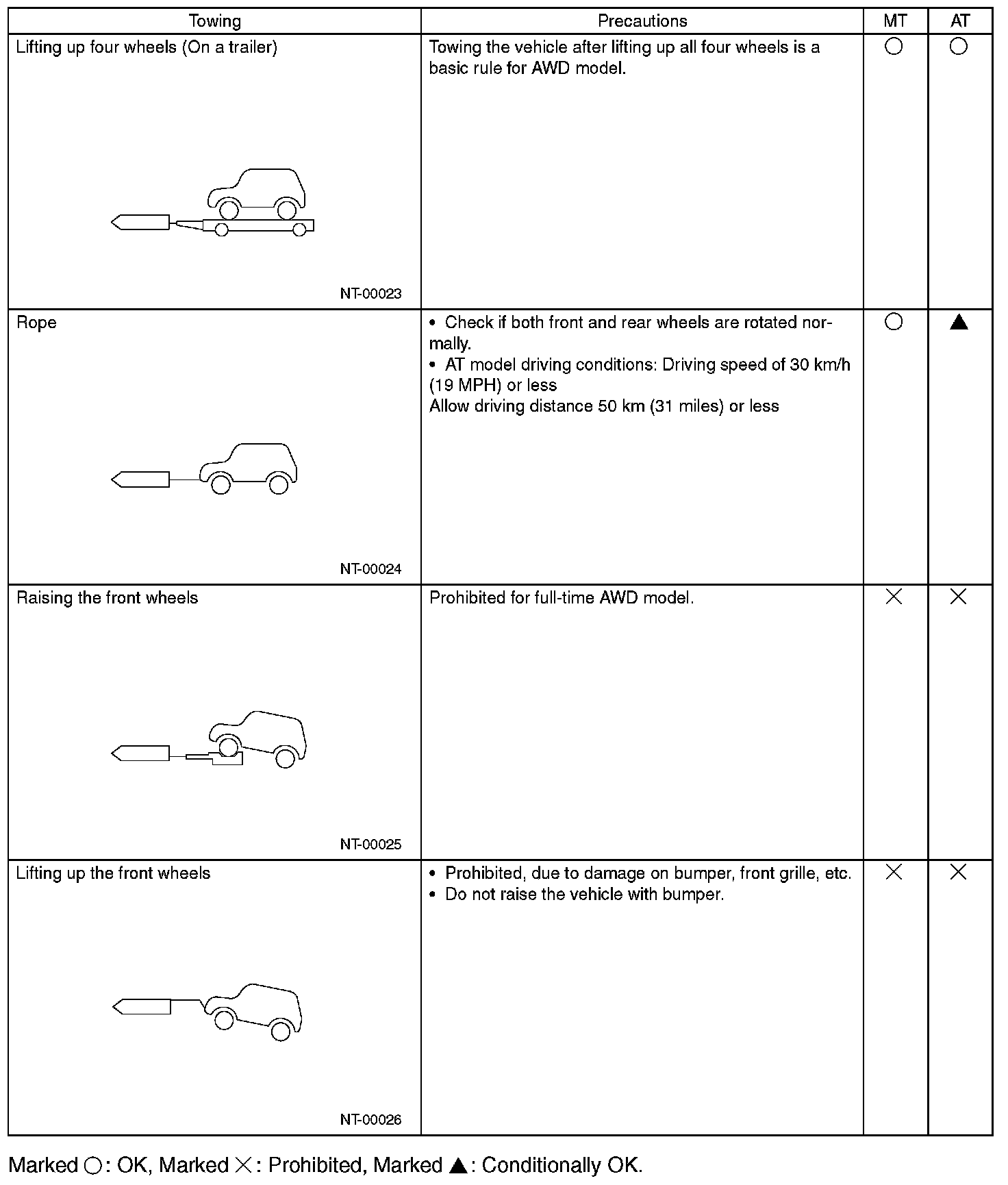Avoid towing vehicles except when the vehicle cannot be driven. For models with AWD, AT or VTD, use a loader instead of towing. When towing other vehicles, pay attention to the following to prevent hook or vehicle damage resulting from excessive weight.