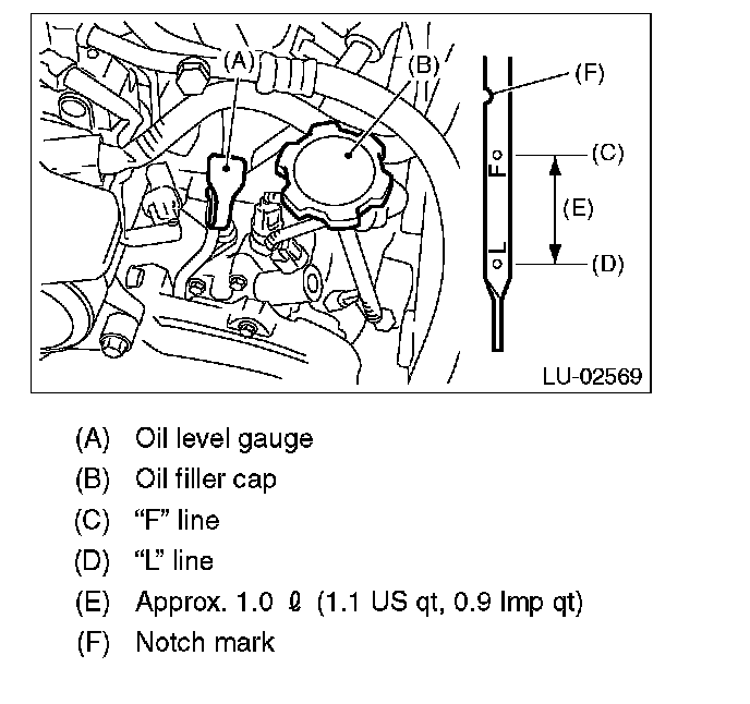 4) Pull out the oil level gauge again, and check the oil level. If the engine oil level is below "L" line, check for oil leakage from engine and add oil to bring the level up to "F" line.