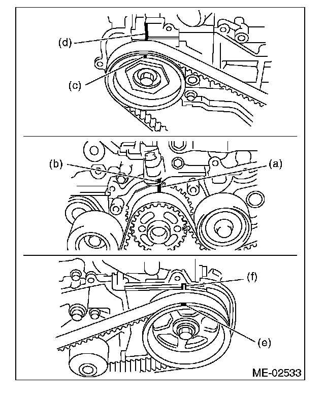 (1) Use the ST to turn crankshaft. Align the mark (a) of sprocket to the mark (b) of oil pump, and then ensure the right side cam sprocket mark (c), cam cap and cylinder head matching surface (d) or left side cam sprocket mark (e), timing belt cover notch (f) are properly adjusted.