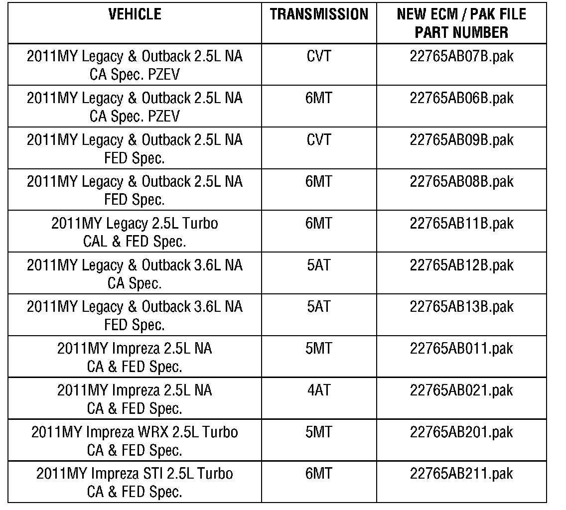 ^ 2011 MY Subaru Legacy, Outback, Impreza (including WRX & STI)