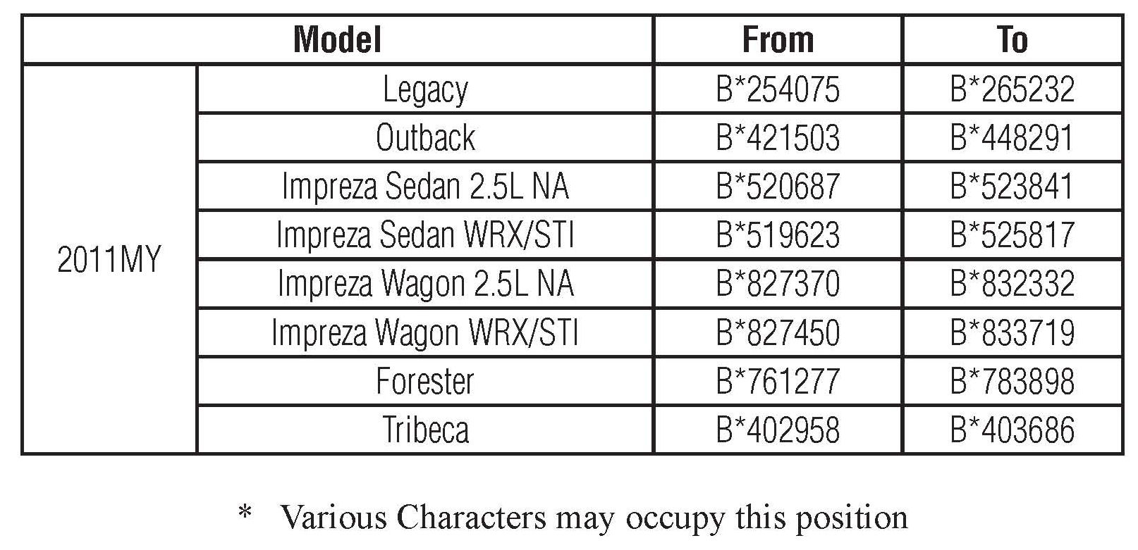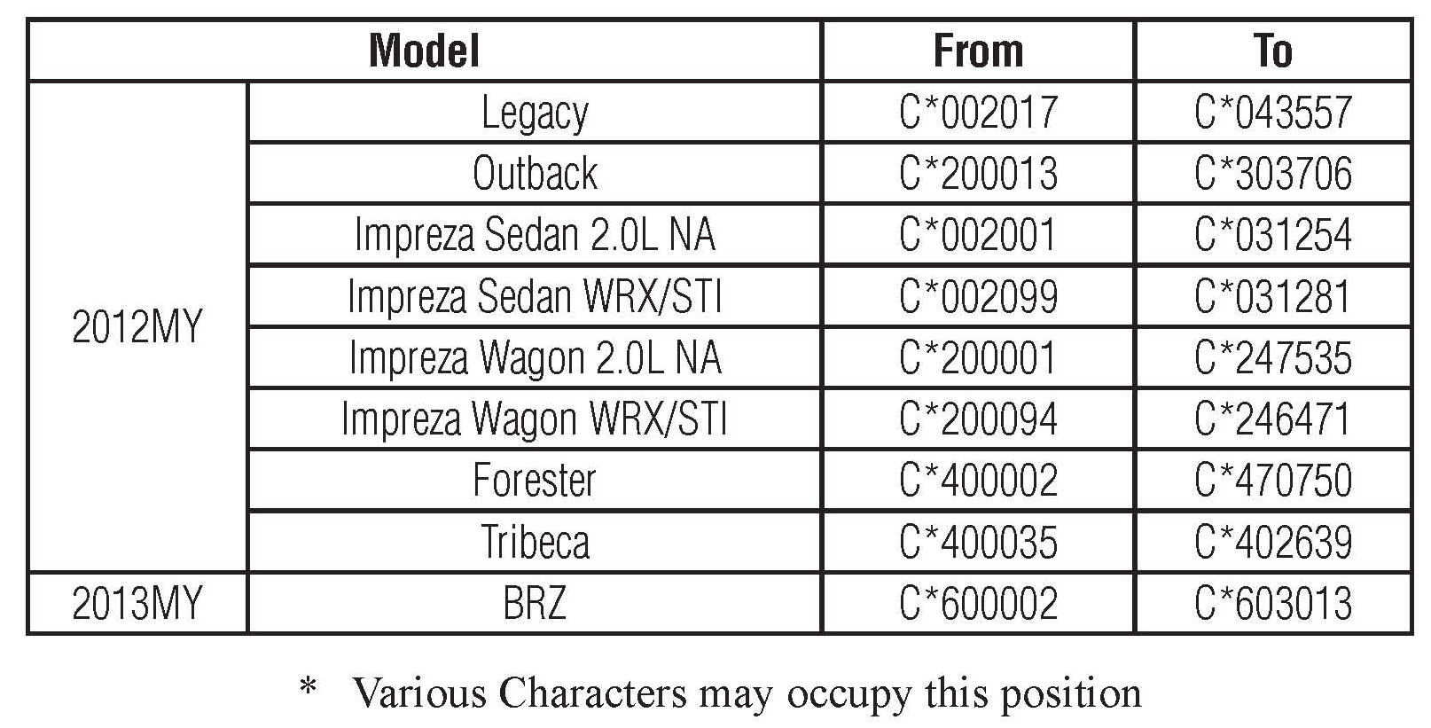 Affected vehicles are identified in the VIN range chart below. NOTE: Not all vehicles in the VIN ranges are affected. Prior to performing repairs, confirm coverage by using the Vehicle Coverage Inquiry function at Subarunet.com.