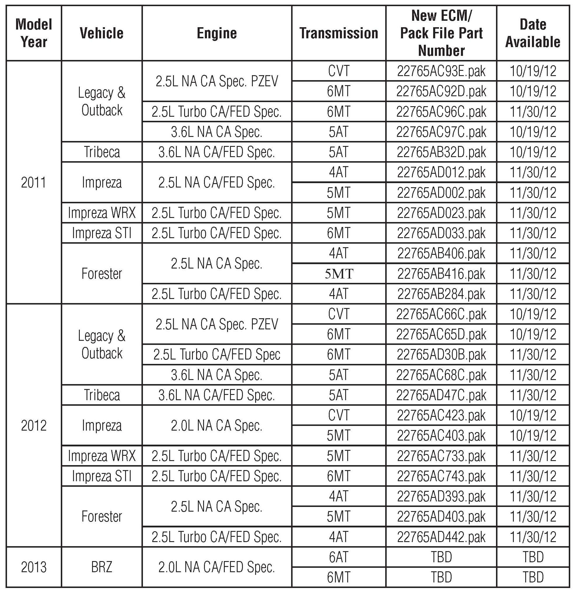 Subaru of America, Inc. has determined that vehicles affected by this Service Program require ECM reprogramming.