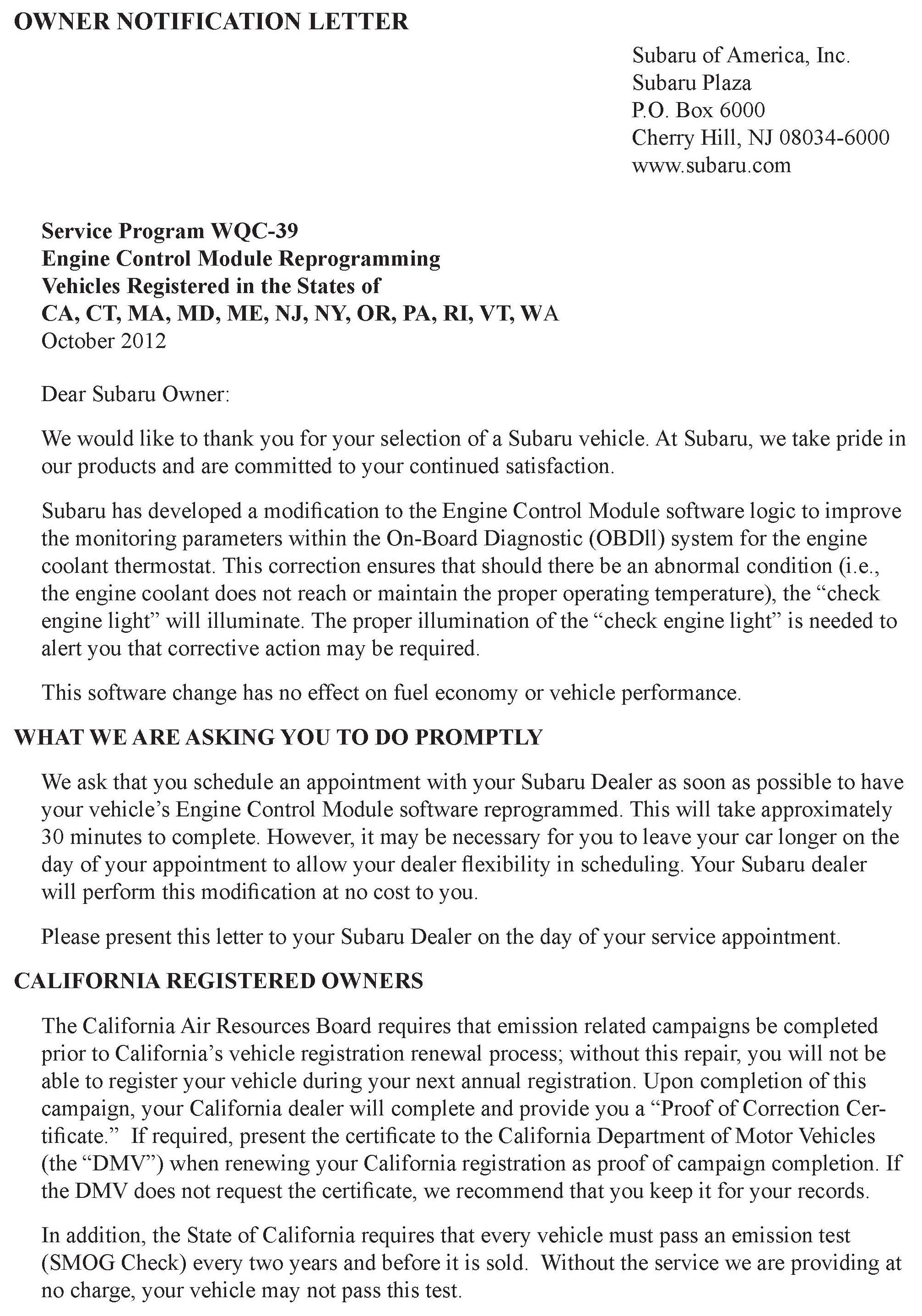 The California Air Resources Board and the Department of Motor Vehicles Registration/Recall Program requires that all emission related Recall/Campaign or Service Program repairs be completed before a vehicle registration is renewed. Please provide owners of vehicles registered in the state of California a completed "Vehicle Emission Recall - Proof of Correction" certificate. Vehicle owners should be advised to retain this certificate because the California Department of Motor Vehicles may require they provide proof this service program repair has been completed.