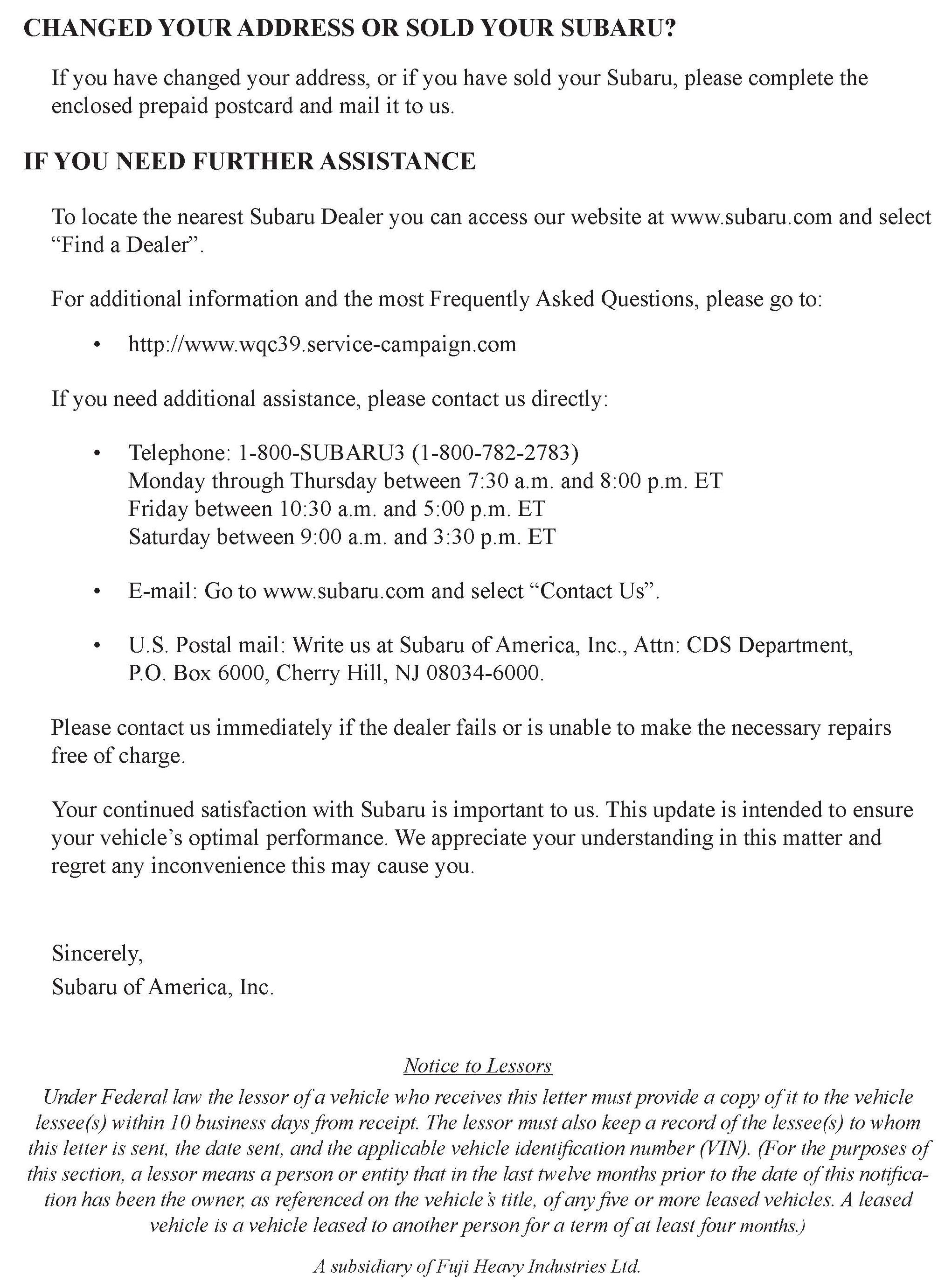 Additional labels are available through the Subaru Claims Helpline.