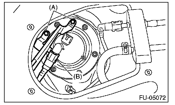 - Align protrusion (B) of the fuel sub level sensor to the cutout in the fuel sub level sensor upper plate.