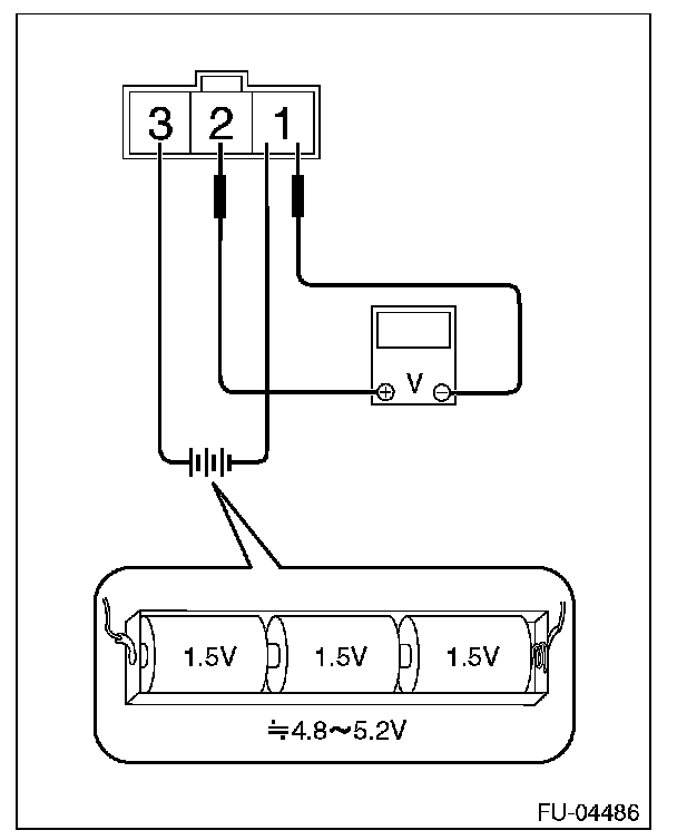 2. Connect dry-cell battery positive terminal to terminal No. 3 and dry-cell battery ground terminal to terminal No. 1, circuit tester positive terminal to terminal No. 2 and the circuit tester negative terminal to terminal No. 1.