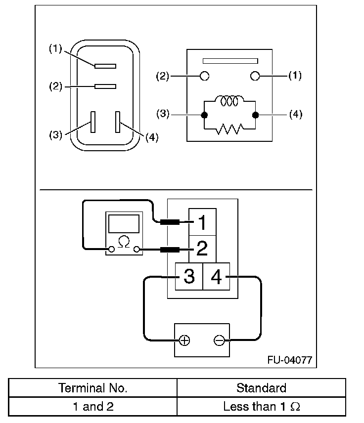 3. Connect terminal No. 3 to battery positive terminal and terminal No. 4 to the battery ground terminal, and check the resistance between the main relay terminals.