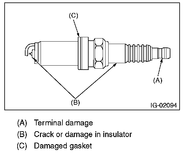 2. Check the spark plug electrode and condition of the insulator. If abnormal, check and repair the cause and replace the spark plug.