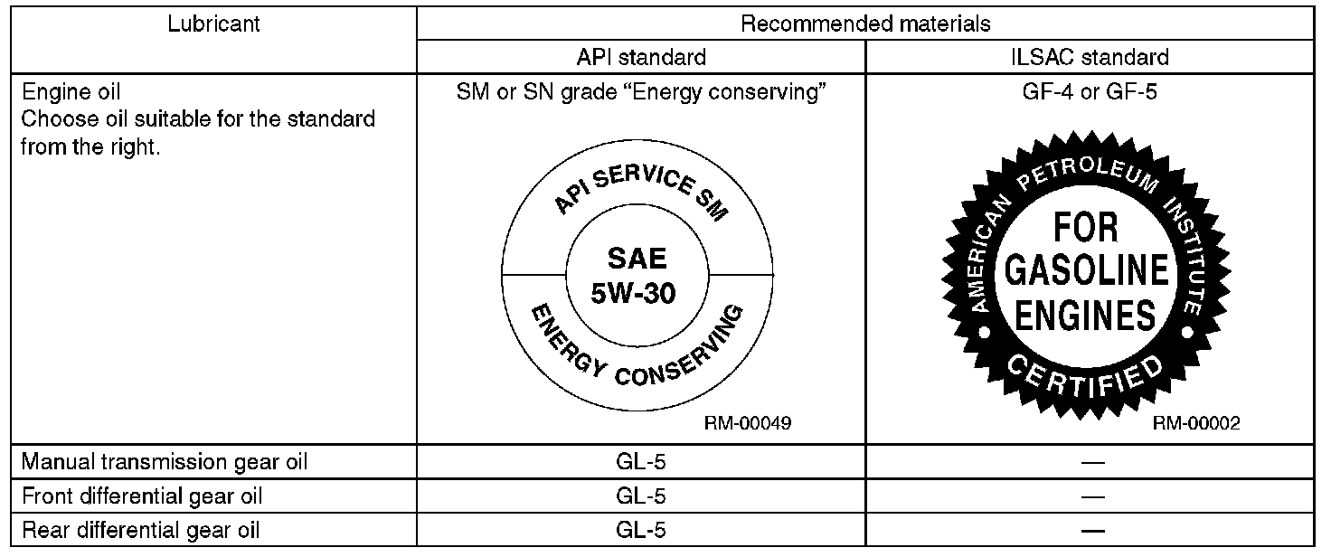 Use the lubricants shown in the table below, or equivalent. See the table below to choose the correct SAE viscosity.