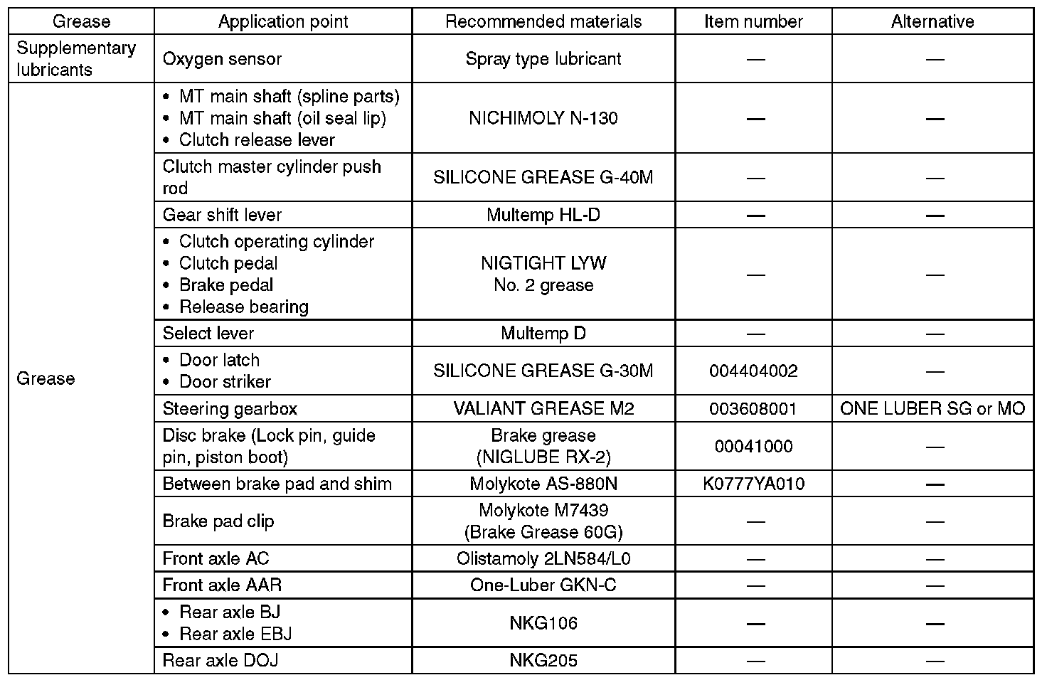 Use grease and supplementary lubricants shown in the table below.