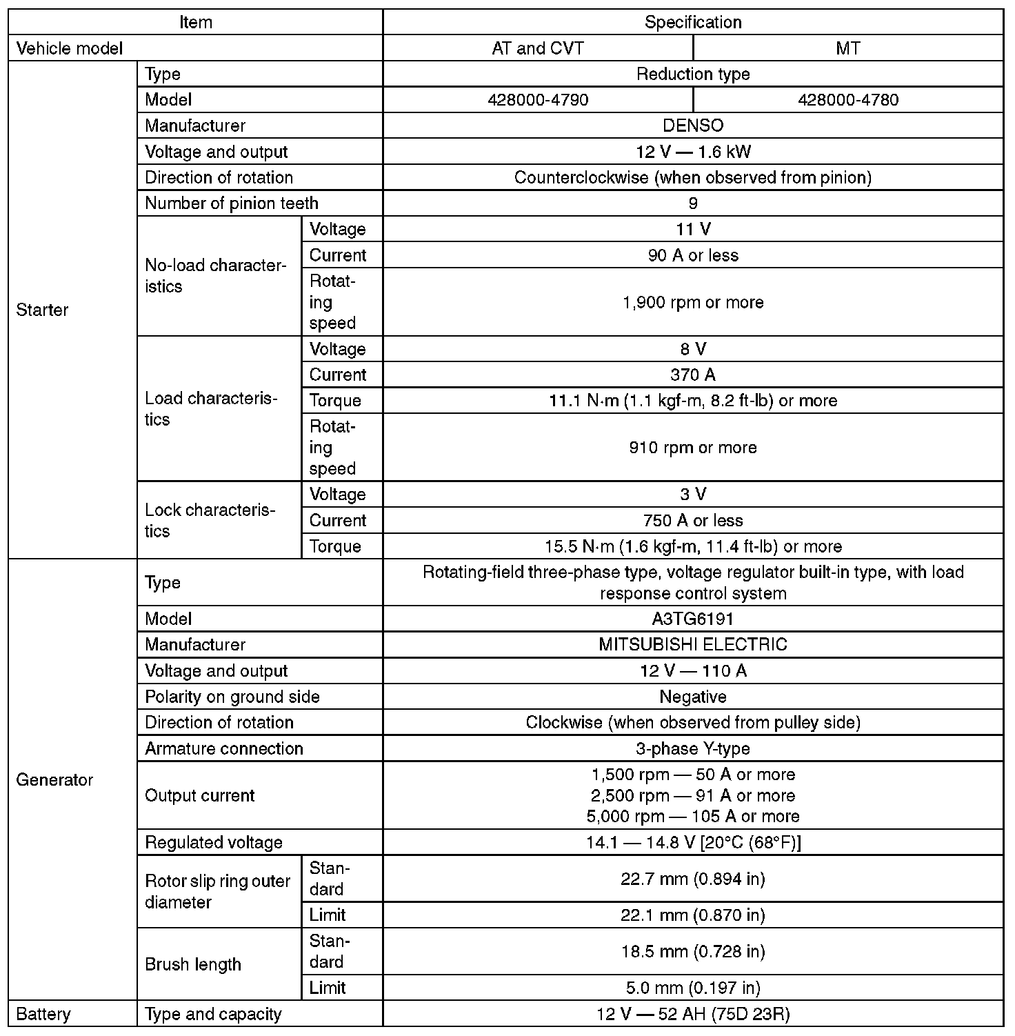 Starting and Charging: Specifications