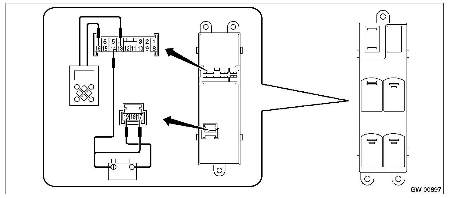 2. Connect the battery and the Subaru Select Monitor to the power window main switch terminal.