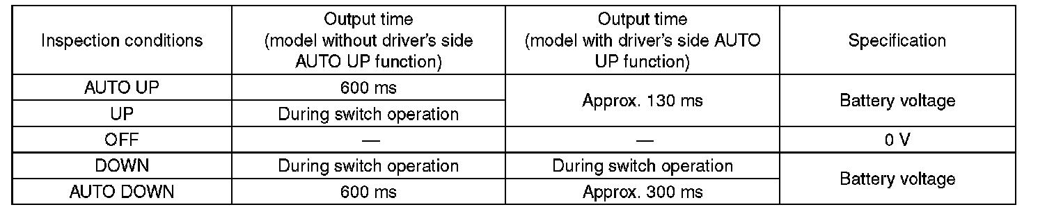 NOTE: Since output time during window UP operation is extremely short, it cannot be checked without using a measuring instrument such as oscilloscope. Output is constantly produced while the switch is operated for window DOWN operation.