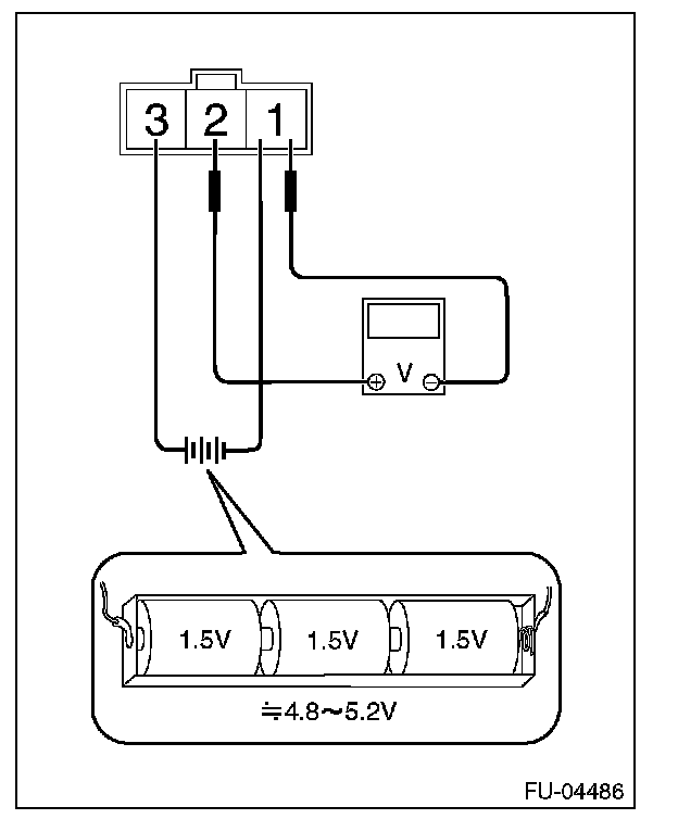 2. Connect dry-cell battery positive terminal to terminal No. 3 and dry-cell battery ground terminal to terminal No. 1, circuit tester positive terminal to terminal No. 2 and the circuit tester negative terminal to terminal No. 1.