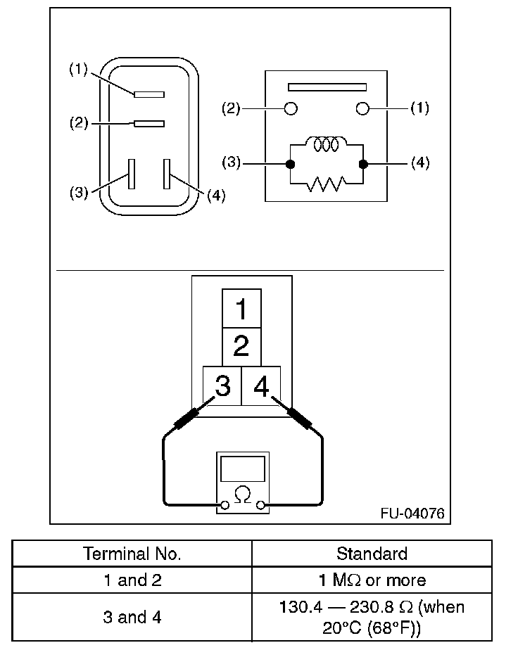 3. Connect battery positive terminal to terminal No. 3 and battery ground terminal to terminal No. 4, and measure the resistance between the main relay terminals.