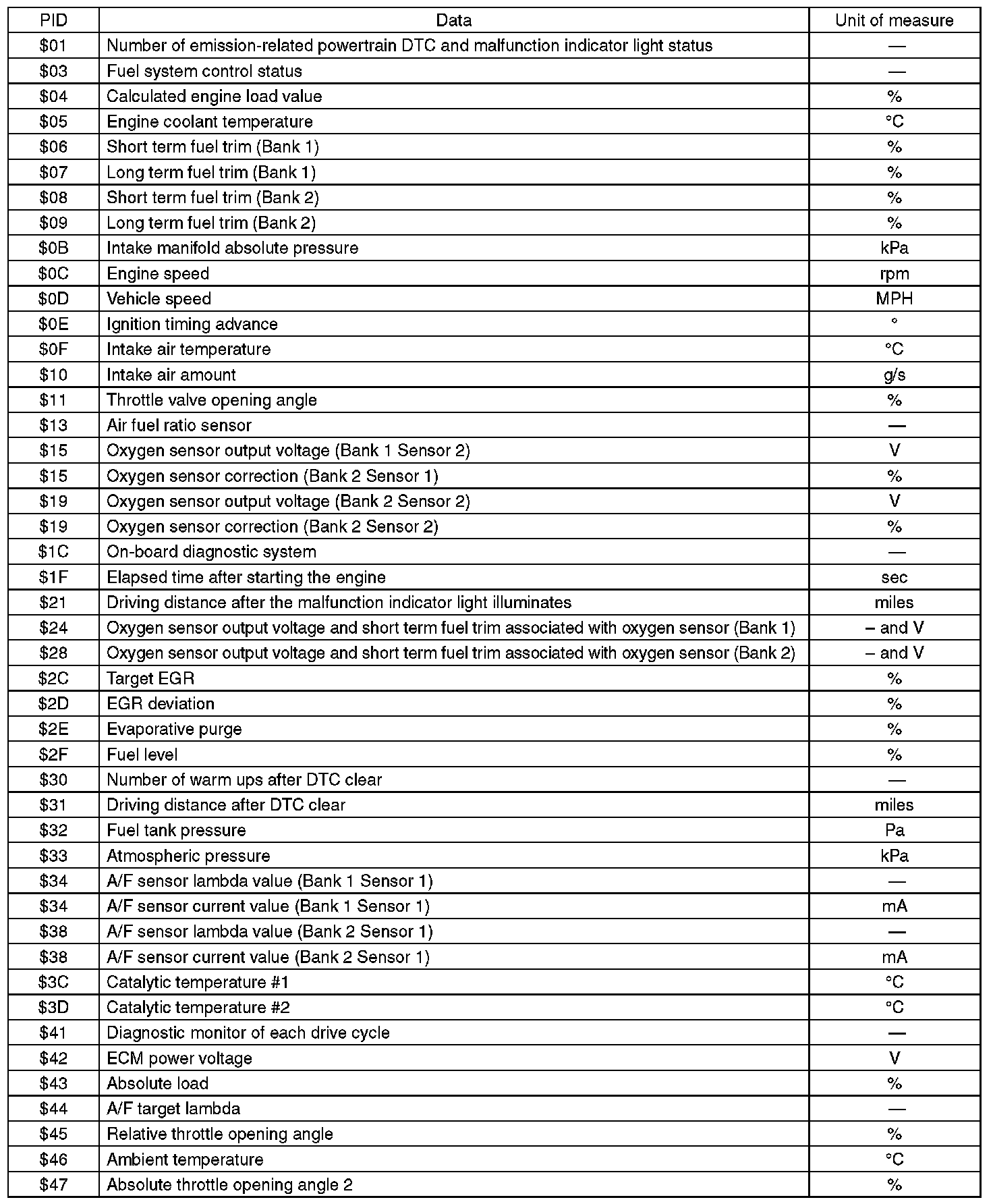 NOTE: Refer to general scan tool manufacturer s instruction manual to access the generic OBD-II PID (MODE $01).