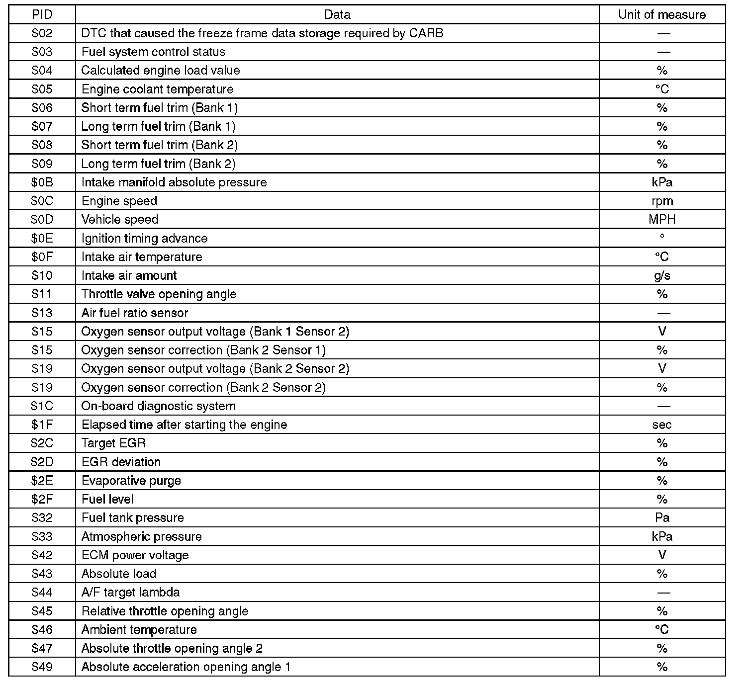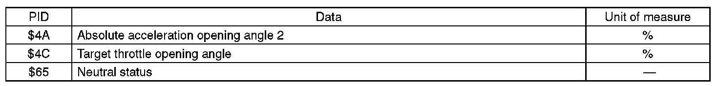 A list of the support data and PID (Parameter Identification) codes are shown in the following table.