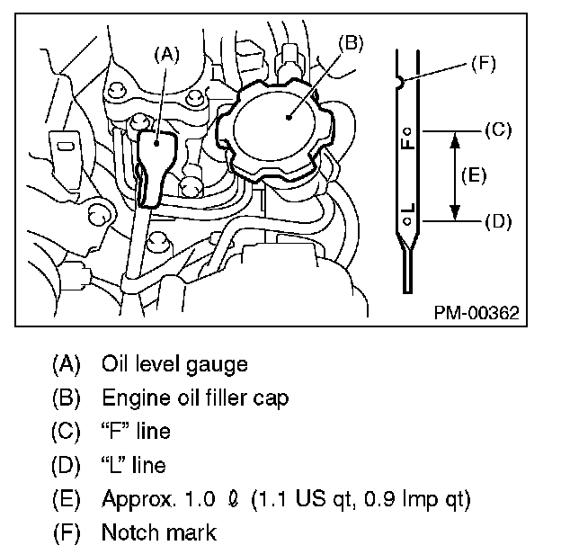 9) After stopping the engine, recheck the oil level. If necessary, add engine oil up to the "F" line on oil level gauge.