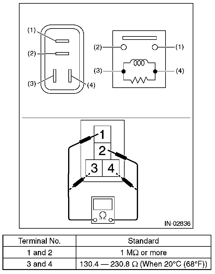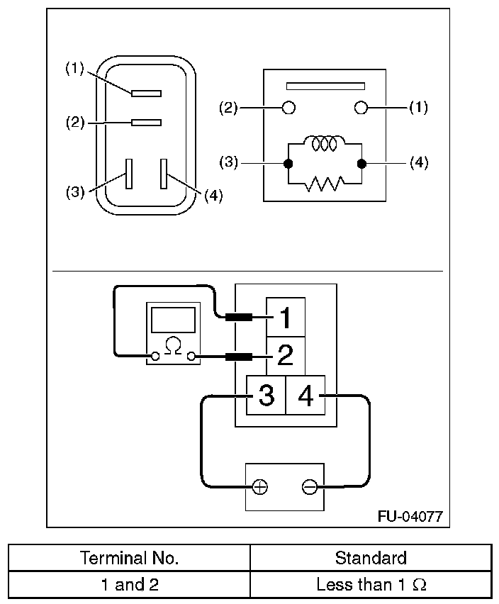 3. Connect terminal No. 3 to battery positive terminal and terminal No. 4 to the battery ground terminal, and check the resistance between the main relay terminals.