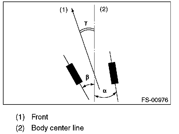 Thrust angle is a mean value of left and right wheel toe angles in relation to the vehicle body center line. Vehicle is driven straight in the thrust angle direction while slanting in the oblique direction depending on the degree of the mean thrust angle.