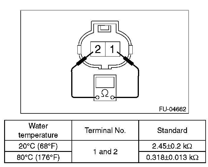 3. Raise water temperature gradually, measure the resistance between the engine coolant temperature sensor terminals when the temperature is 20°C (68°F) and 80°C (176°F).