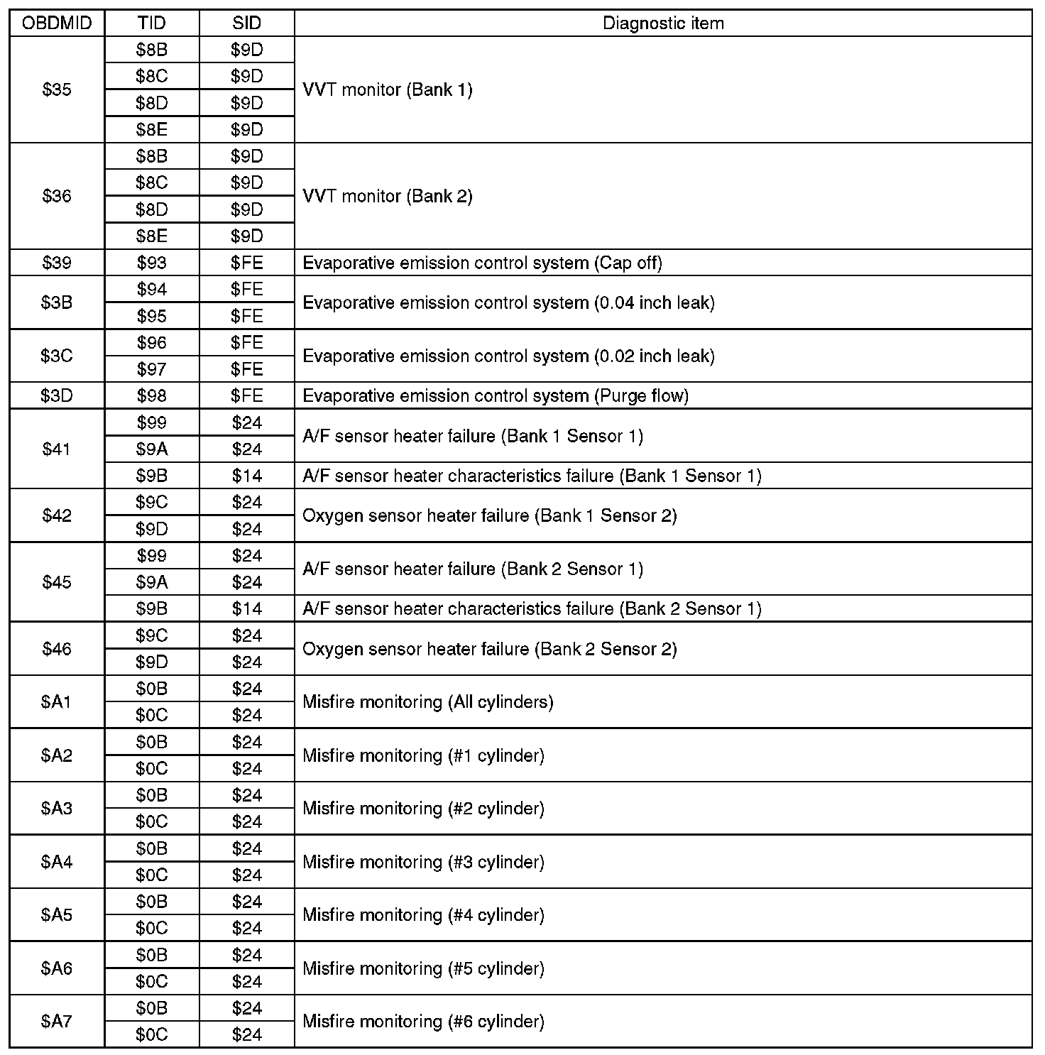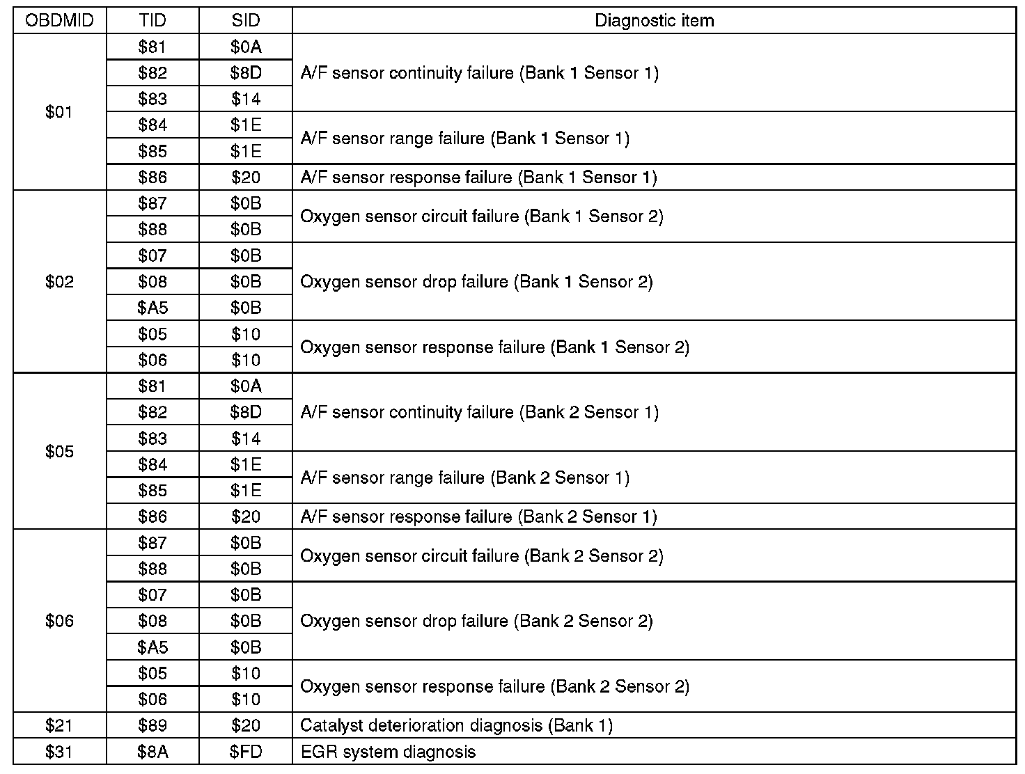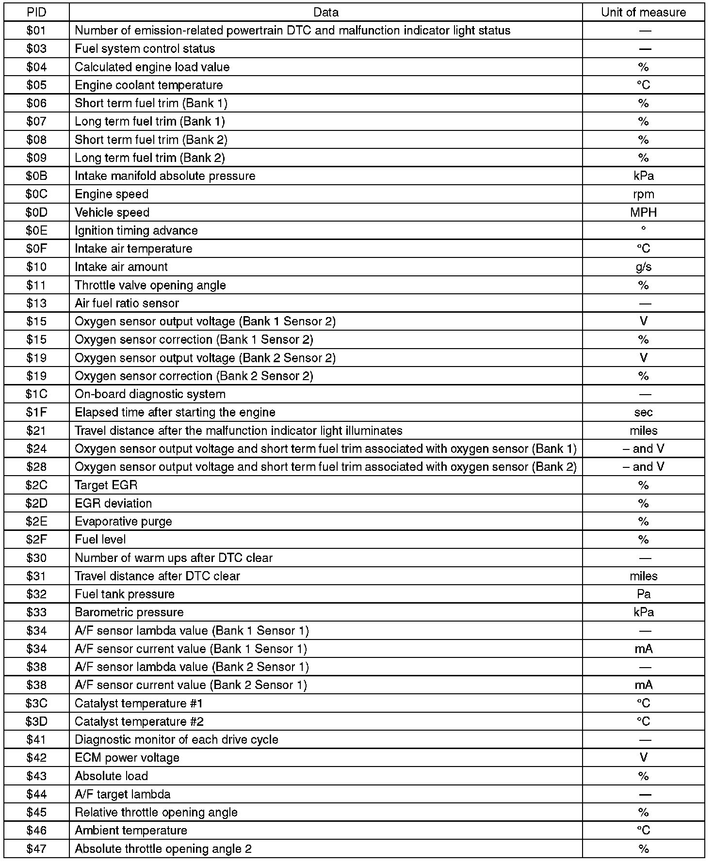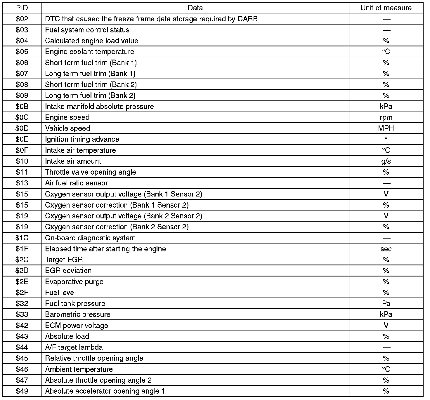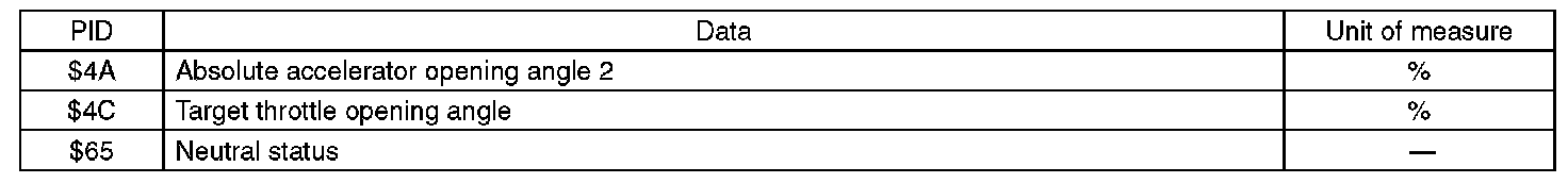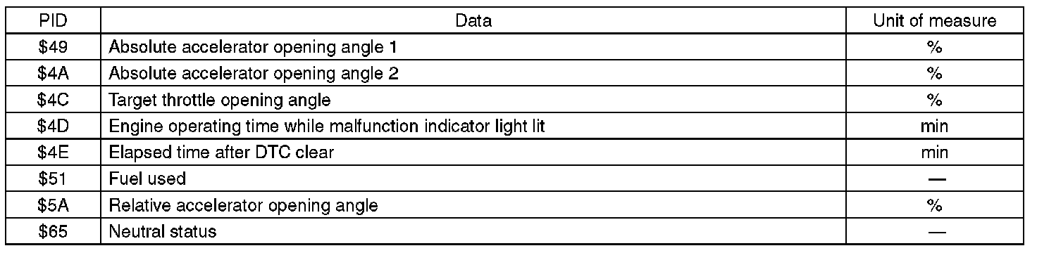 A list of the support data and PID (Parameter Identification) codes are shown in the following table.