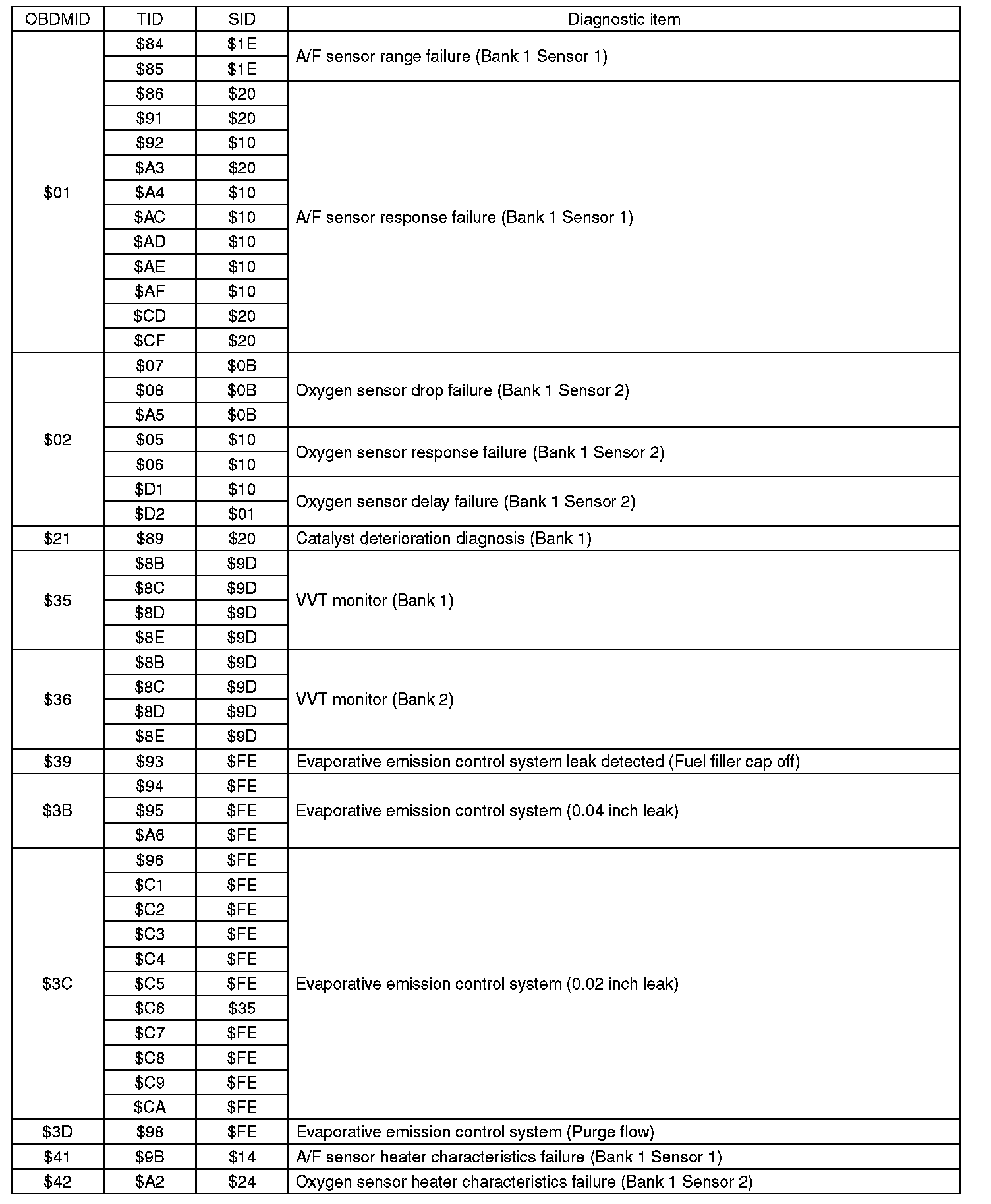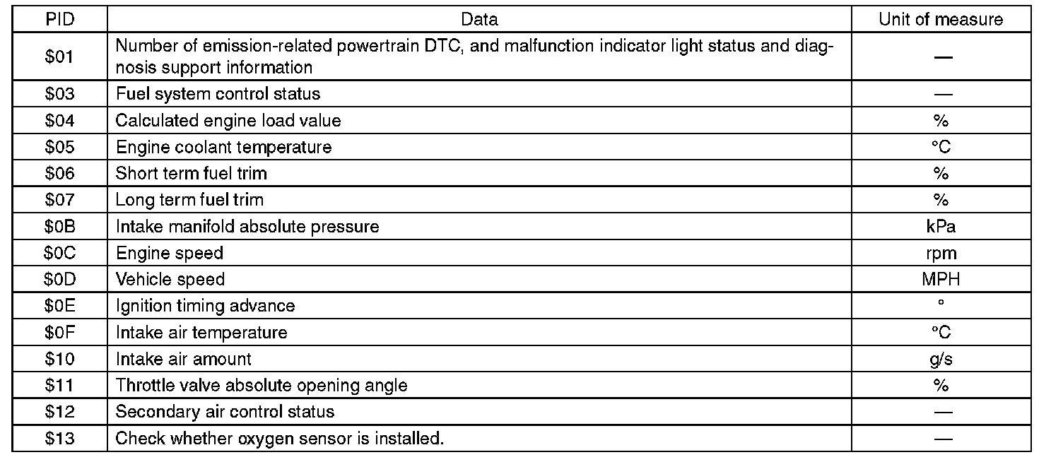 A list of the support data and PID (Parameter Identification) codes are shown in the following table.